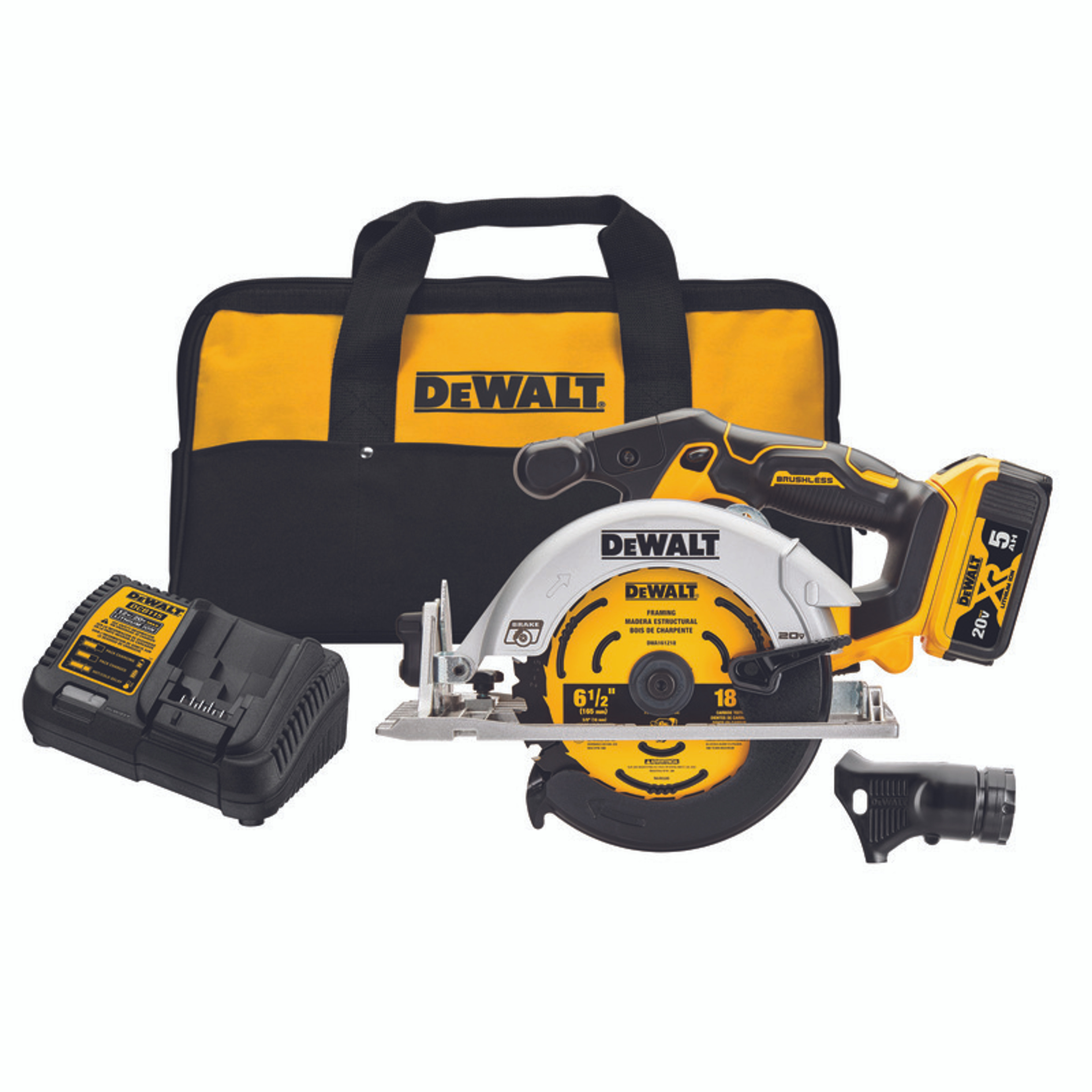 DeWALT Circular Saw Kit, Brushless Cordless, Bare Tool/Kit: Kit, 6-1/2 in Dia Blade, 5/8 in Arbor/Shank, 4950 rpm Speed, 1-5/8 in at 45 deg, 2-9/16 in at 90 deg Cutting Depth, 90/45 deg Cutting Angle, Bevel Capacity: 0 to 50 deg, 20 V, Li-Ion Battery, 5 Ah Battery, Battery Included: Yes