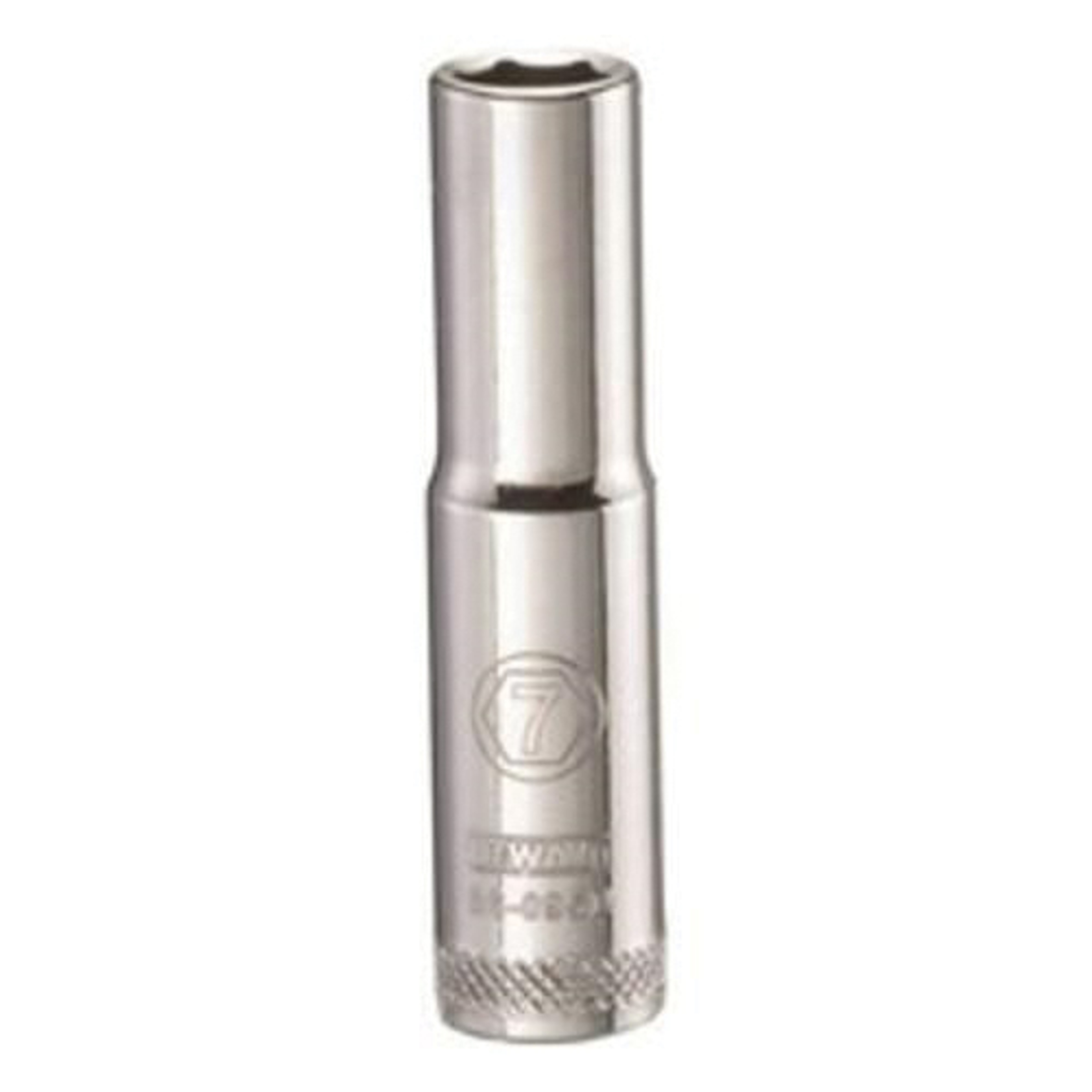 DeWALT Socket, Deep Length, Series, Measurement System, Hex Drive, Drive Size, in 1/4, Socket Size, mm 7, Opening Depth, Socket End Width, Number of Points, Bolt Clearance Depth, Chrome Vanadium Steel, Finish