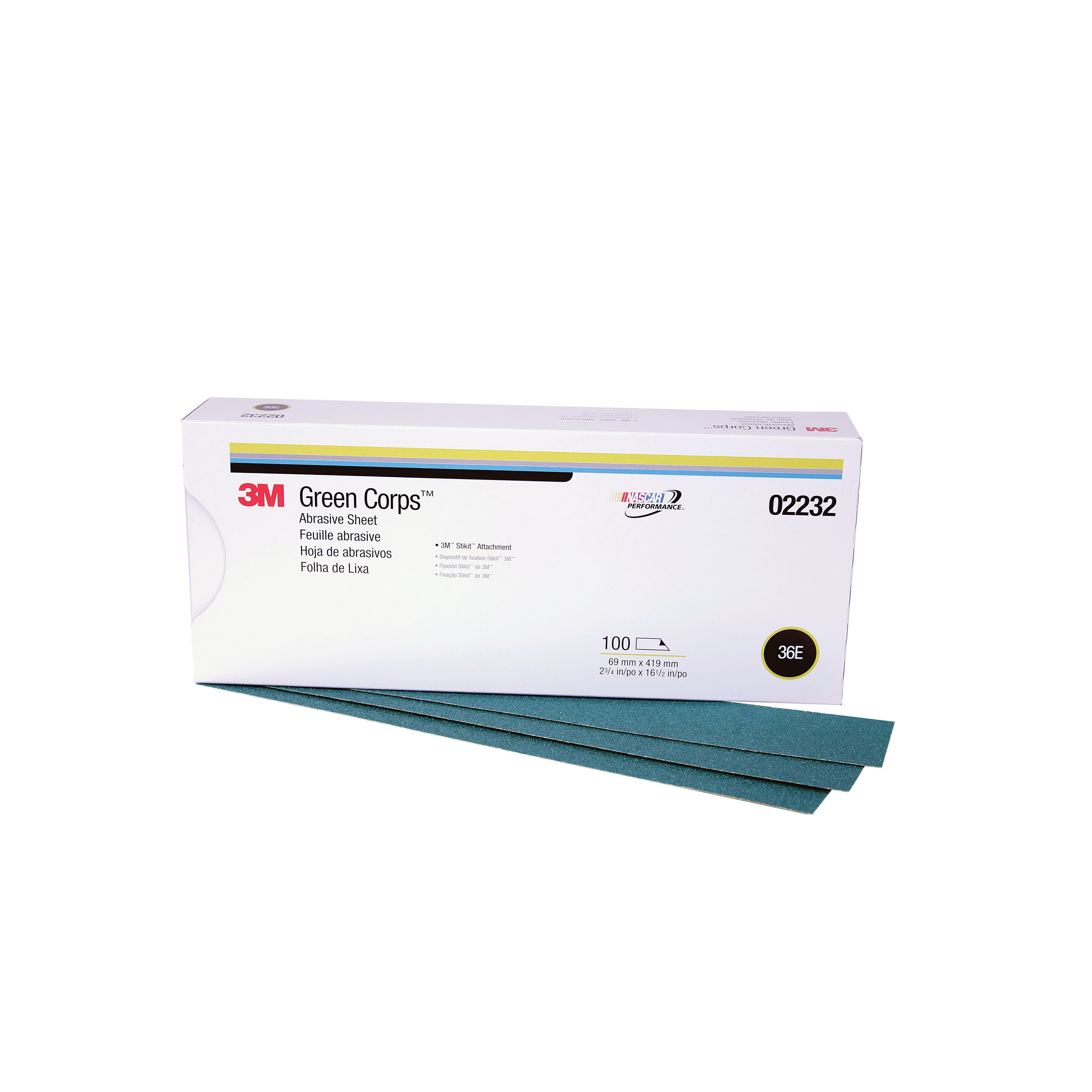 3M Stikit green Corps abrasive sheet 251U shapes plastic filler and strips paint to bare metal. Green Corps abrasives are built-on E-weight backing to make them extremely durable for sanding paint metal or fiberglass. Abrasive sheets feature an anti-loading stearate coating. Ceramic aluminum oxide mineral blend delivers a fast cut and long life. 3M Stikit green Corps abrasive sheet 251U excels at filler shaping, metal shaping, paint removal and rust removal on automotive bodies. Green Corps products are made with a blend of abrasives including 3M high performance ceramic abrasive grain, which provides increased abrasive life and a faster cut rate. Use these sheets on the following surfaces - clear coats, fiberglass, filler, metal, paint and plastic. Open coat construction reduces loading on fresh filler. Use these sheets for dry sanding applications. Green Corps abrasives are built-on E-weight backing to make them extremely durable for sanding paint metal or fiberglass. These abrasive sheets are made with our 3M Stikit system, which offers convenient changes between grades or applications. Stikit sheets come ready-to-use with a pressure sensitive adhesive coating on the backside so that attaching them is as simple as pressing on a sticker, yet they remove cleanly without leaving any sticky residue behind. We suggest using our 3M Stikit hand file board part number (05444) or 3M Stikit air file shoe (3M part number 05448) with these abrasive sheets.