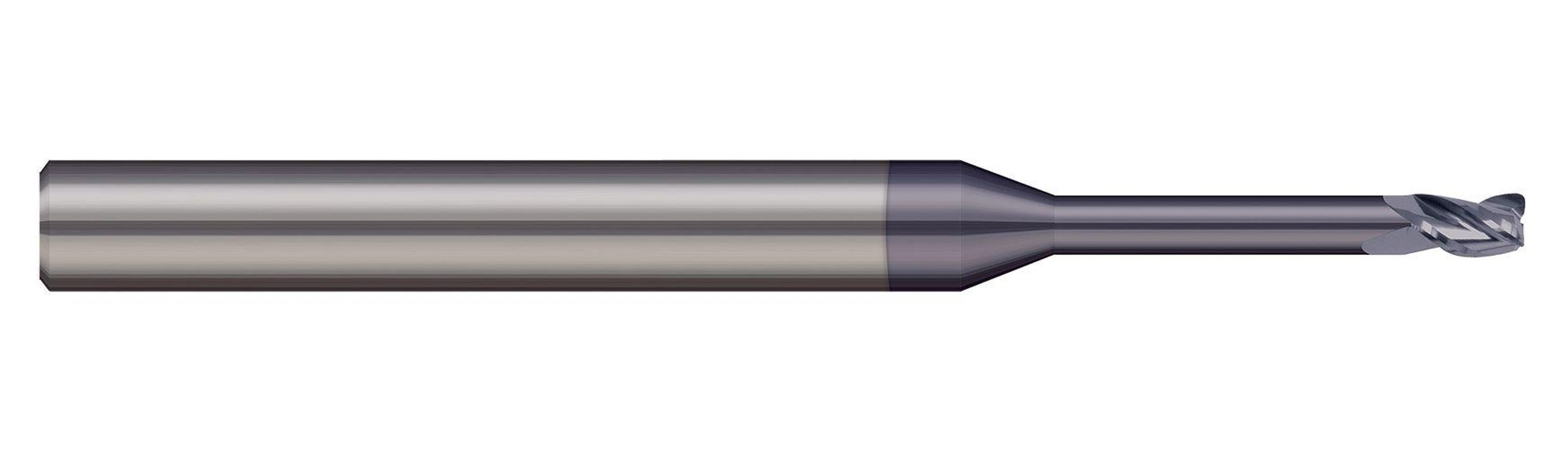 MICRO 100, MEFM-030-1500-15, Corner Radius End Mill, Long Reach - Stub Flute, 3 mm Diameter Cutter, 0.15 mm Corner Radius, 57 mm Overall Length, 3 mm Length of Cut, 2 Flutes, Upcut Flute, 6 mm Shank Diameter, Right Hand Cutting Direction, 20 deg Helix Angle, Cylindrical Shank, Solid Carbide, Uncoated